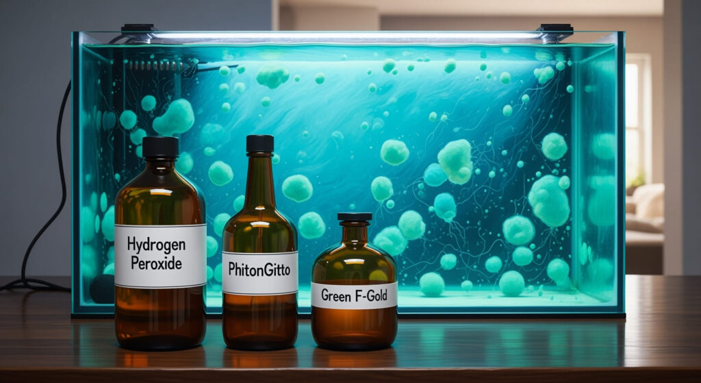 藍藻対策にはオキシドールやフィトンギットも用いられますが、グリーンFゴールドとは作用の仕方や得意な状況が異なります。